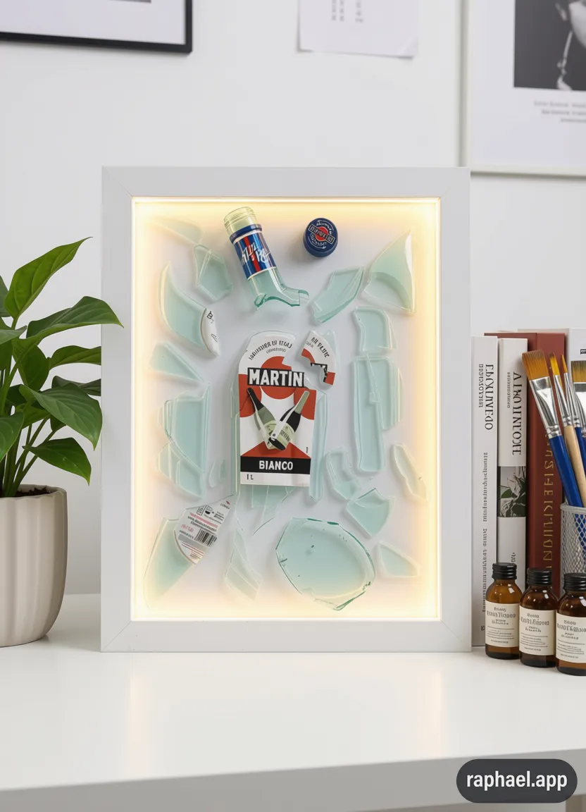 Cuadro de 50 cm X 35 cm con marco en madera, encapsulando piezas de vidrio. Martini Bottle collection es un respiro de mar profundo que embriaga hasta los más sensatos pensamientos. Incluye iluminación LED interna, recargable USB. ———————————– A 50 cm x 35 cm framed wooden artwork encasing glass pieces. The Martini Bottle collection is a breath of the deep sea that intoxicates even the most level-headed thoughts. Includes internal LED lighting, USB rechargeable.