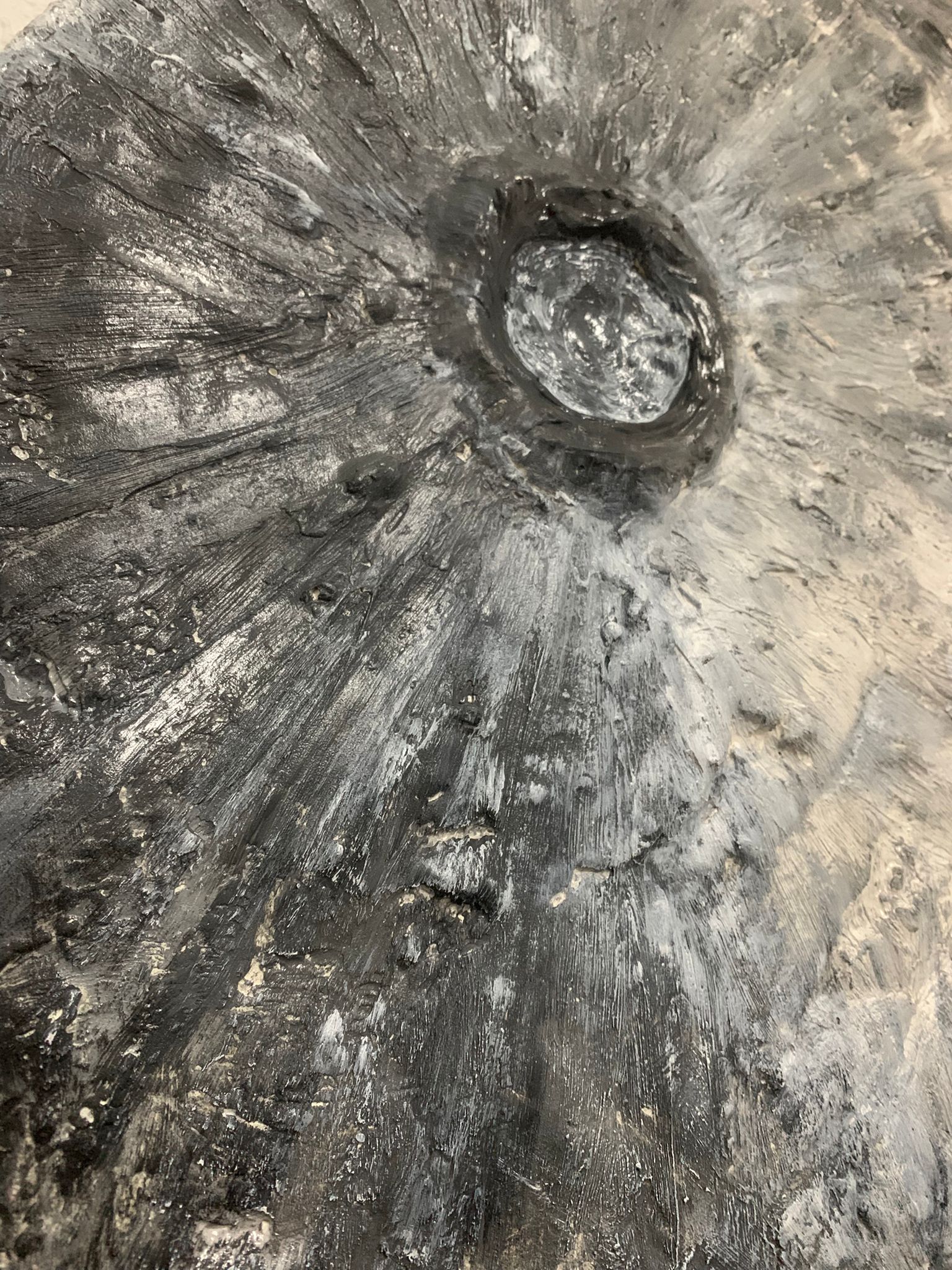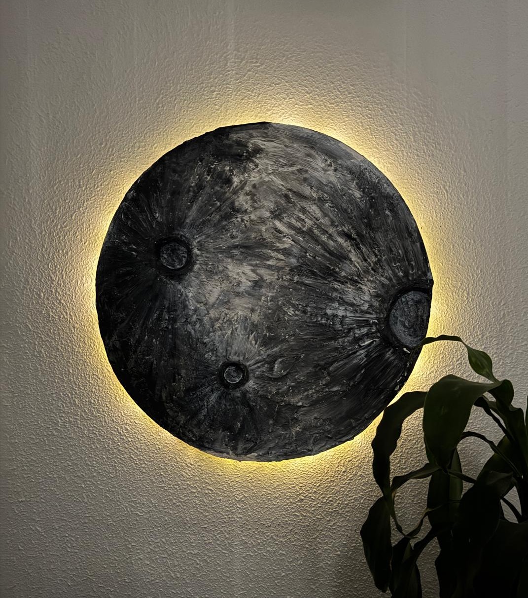 Lunas hechas a mano de diferentes tamaños. Sus materiales; entre ellos yeso, acrílicos, icopor y resina. Todas las Lunas traen iluminación alrededor en su perímetro. Esta Luna tiene 80 cms de diámetro e iluminación sencilla. Ideal para espacios comerciales o de vivienda, incluso para espacios para niños.